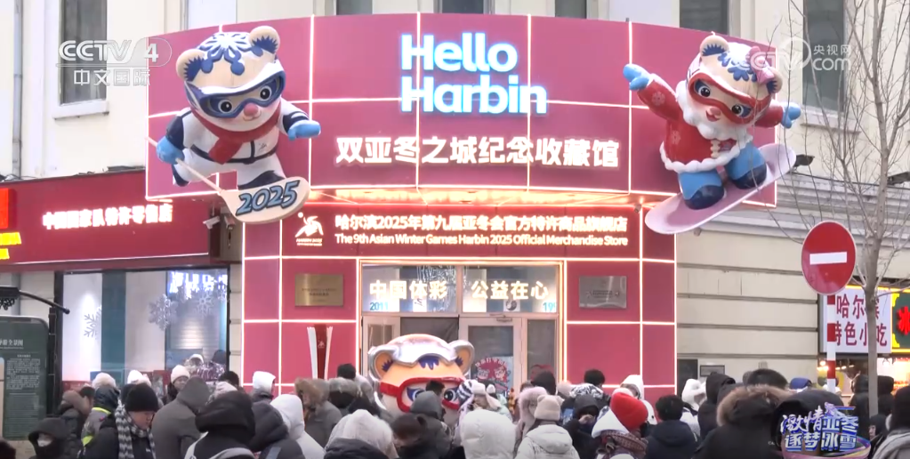 來到哈爾濱的中央大街,在記者背后能看到的就是一家亞冬會的官方特許商品旗艦店。隨著亞冬會的召開,這里的人氣變得越來越旺了。