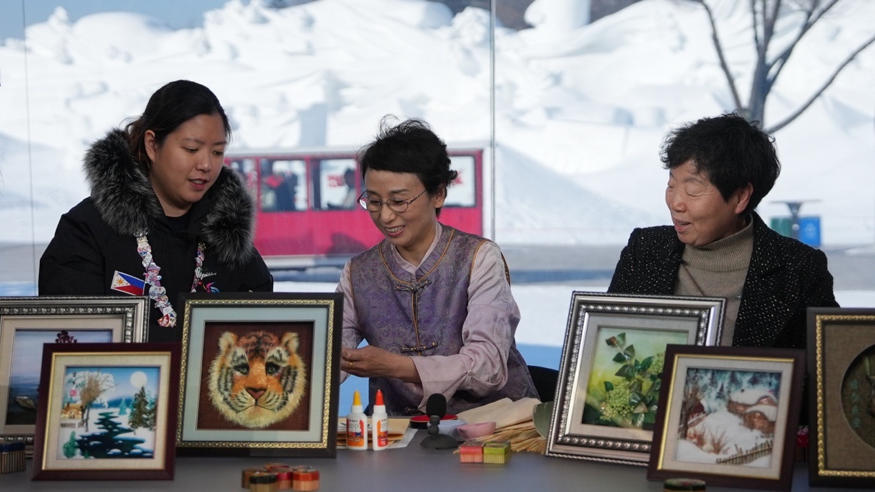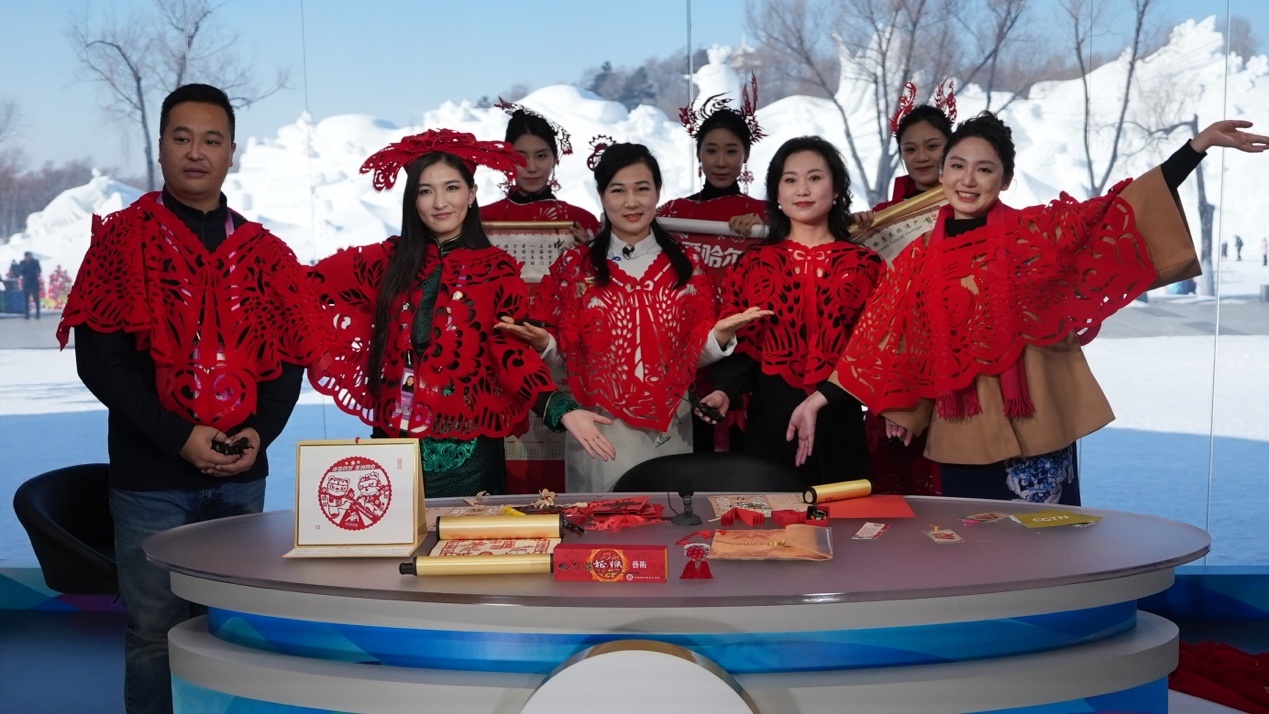 參加“當(dāng)亞冬會(huì)遇上‘非遺年’”人文交流活動(dòng)的中外嘉賓在哈爾濱太陽(yáng)島雪博會(huì)CMG演播室同慶新春