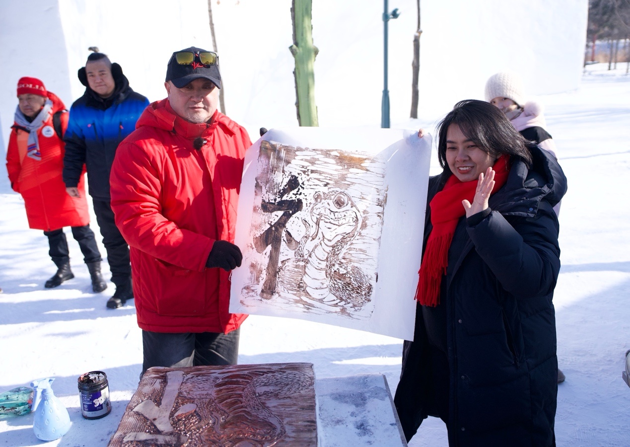 泰國(guó)駐華大使館二等秘書王安安在黑龍江省藝術(shù)研究院冰版畫研究院副院長(zhǎng)盛琰的指導(dǎo)下,制作出冰版畫《畫蛇添?!?,用蛇的形狀和漢字的偏旁部首組合雕刻出漢字“?!辈⑼赜〕鰜?lái),寄托對(duì)中國(guó)農(nóng)歷蛇年的祝福。