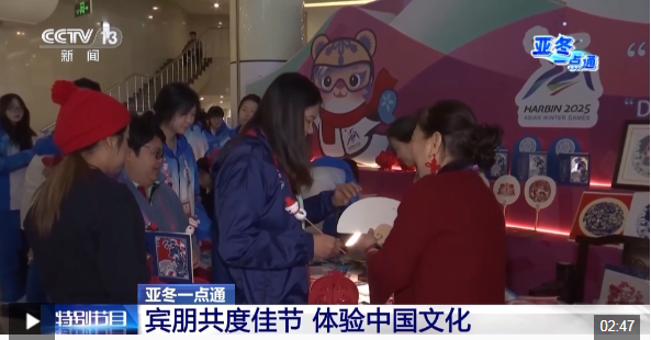 總臺央視記者 王晨:我現(xiàn)在是在位于哈爾濱亞冬會運動員村的一樓展廳,這里正在舉行“冰雪同夢·亞洲同心”非物質文化遺產展示活動。今天是開幕式后的第五個比賽日,展示活動持續(xù)進行中,有金漆技藝、方正剪紙、木雕重彩、皮影戲等非遺代表性項目展臺。