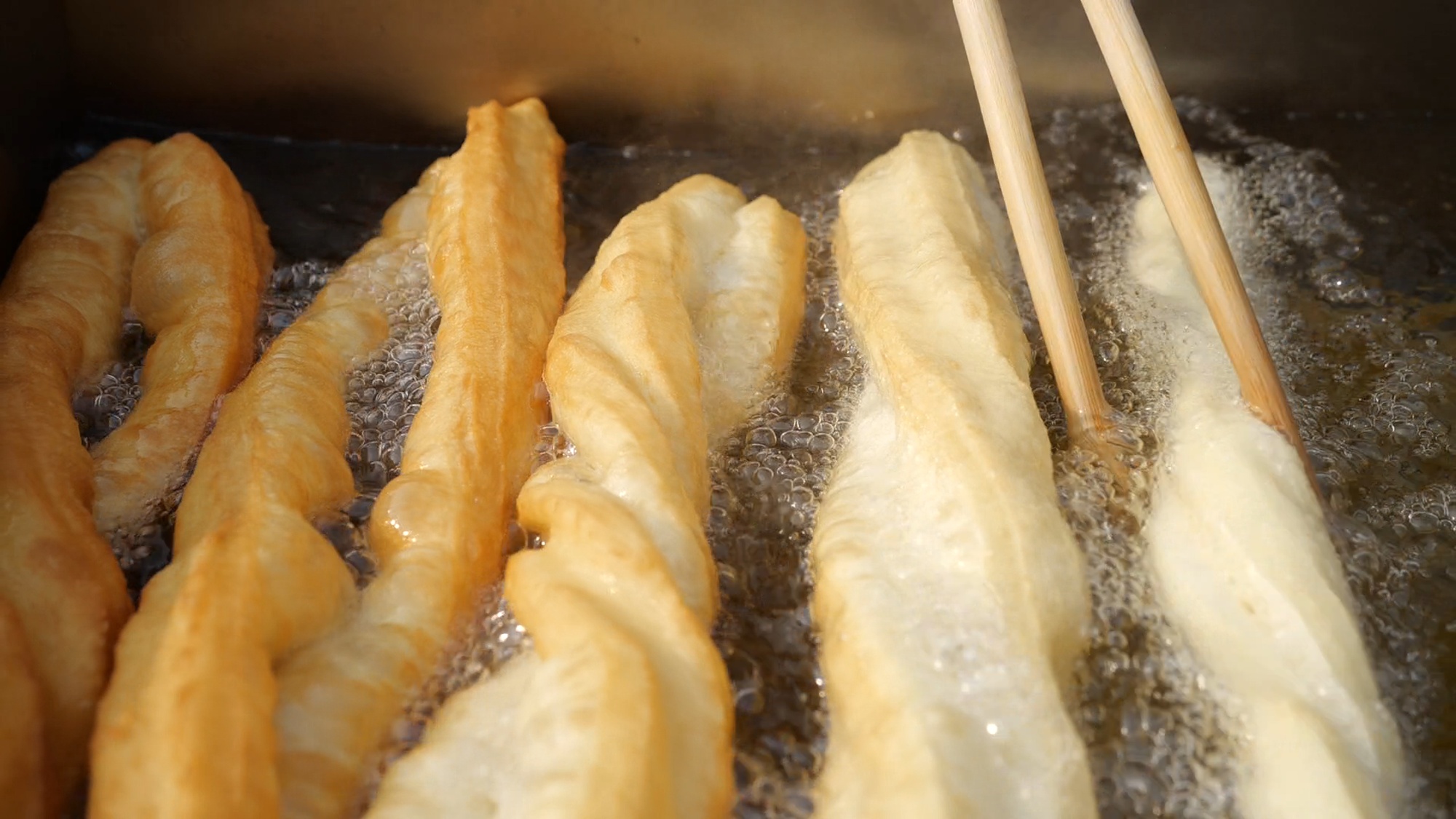 史梅菊賣早餐賣了二三十年,今年她和小叔子江新軍代表江莊村參賽。為防止面團(tuán)粘連,史梅菊用搟面杖在油鍋里沾點(diǎn)油后,再把面團(tuán)搟成長面餅狀。用刀快速切條,兩個(gè)面餅條疊在一起,史梅菊再用手摁壓幾下,給油條在鍋里留足發(fā)酵空間,以此保持油條的蓬松感。江新軍負(fù)責(zé)不停地翻轉(zhuǎn)鍋里的油條。