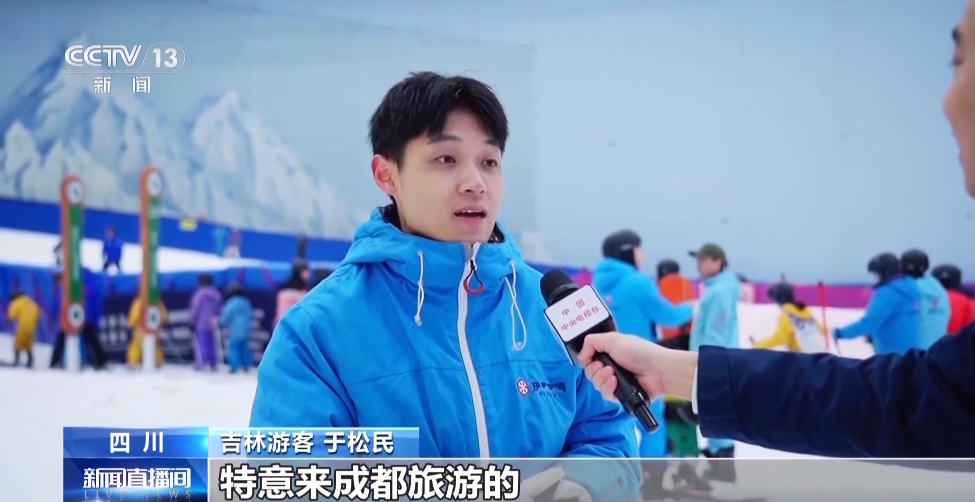 吉林游客 于松民:我是從吉林來(lái)的,特意來(lái)成都旅游的。然后就想特意體驗(yàn)一下成都市內(nèi)的滑雪場(chǎng),沒(méi)有想到今天在這兒看到這么大的一個(gè)滑雪場(chǎng)。