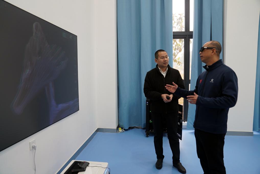 2月17日,在廣西體育高等??茖W(xué)校,韋軍與運(yùn)動健康學(xué)院的老師交流,了解3D模擬運(yùn)動解剖模型如何助力教學(xué)。新華社記者 陳露緣 攝
