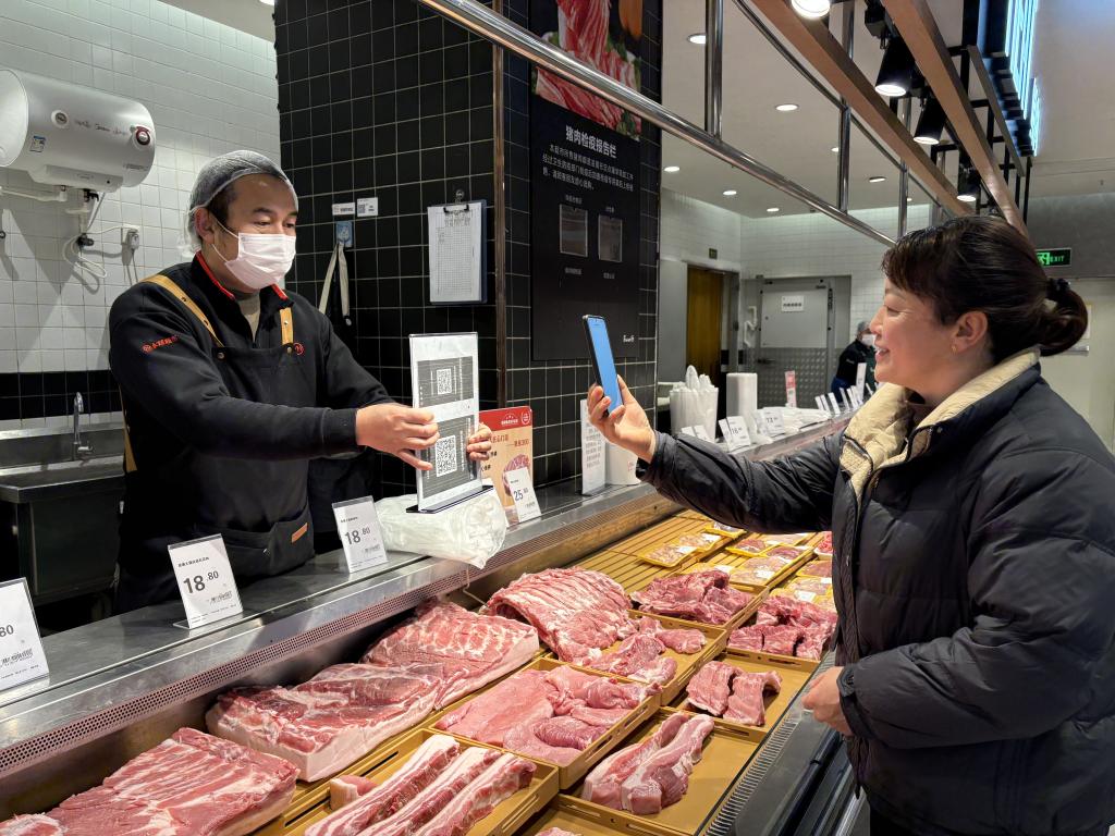 貴陽(yáng)市一家豬肉生鮮門店內(nèi),消費(fèi)者手機(jī)掃碼查看相關(guān)產(chǎn)品信息。新華社記者 李凡 攝