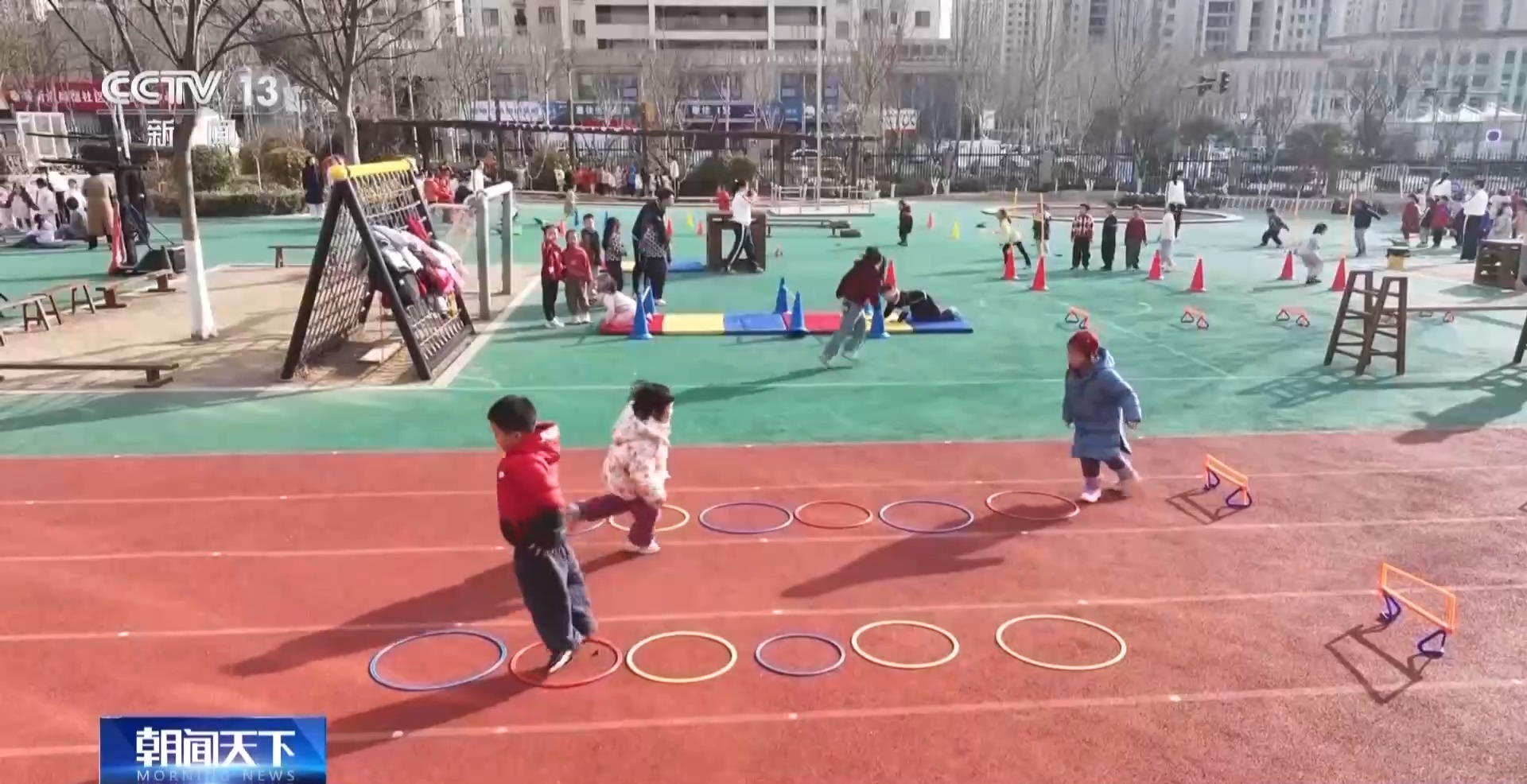 上午9時多,記者來到日照市的一家幼兒園時,孩子們正在做早操。這邊都是3歲以上幼兒園小班到大班的孩子。而在另一片場地,一群2歲多的托班“小小孩”,正在老師的帶領下做游戲。