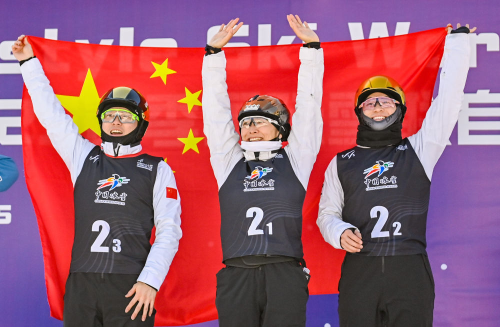 2月24日,在2024-2025賽季國(guó)際雪聯(lián)自由式滑雪世界杯(北大湖站)空中技巧混合團(tuán)體決賽中,由徐夢(mèng)桃、李天馬、齊廣璞組成的中國(guó)一隊(duì)獲得金牌。圖為中國(guó)一隊(duì)徐夢(mèng)桃(中)、李天馬(右)、齊廣璞在頒獎(jiǎng)儀式上。新華社記者 顏麟蘊(yùn) 攝