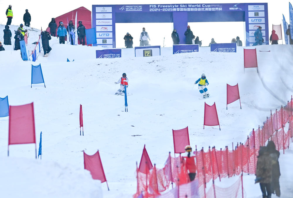 2月22日,2024-2025賽季國(guó)際雪聯(lián)自由式滑雪世界杯(北大湖站)雪上技巧女子雙人比賽在吉林市北大湖滑雪度假區(qū)舉行。新華社記者 顏麟蘊(yùn) 攝