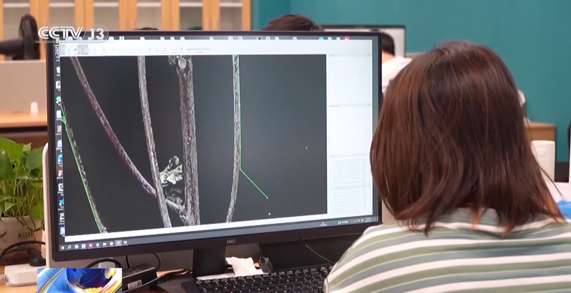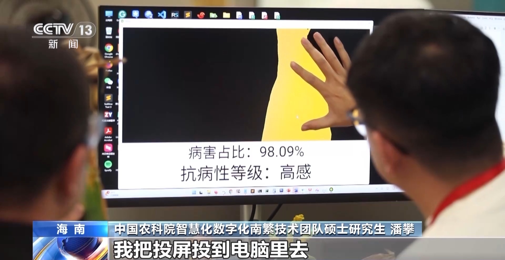 中國(guó)農(nóng)業(yè)科學(xué)院智慧化數(shù)字化南繁技術(shù)團(tuán)隊(duì)碩士研究生 潘攀:這上面的黃色的部分,就是有病害的部分,這個(gè)綠色的部分是,相當(dāng)于是沒有病害的部分。