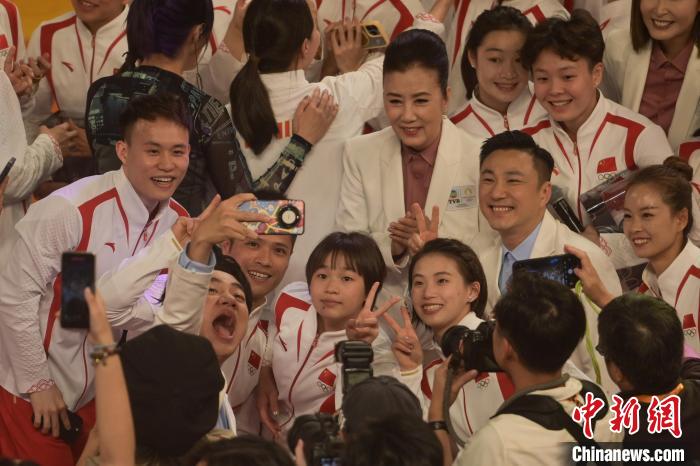 2024年8月30日,訪港的中國內(nèi)地奧運健兒出席奧運健兒大匯演。圖為香港藝人與奧運健兒自拍?!≈行律缬浾?陳永諾 攝