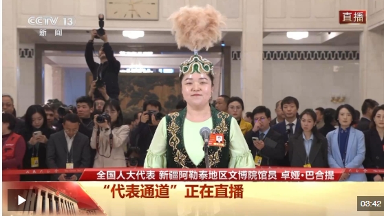 今天(3月11日),十四屆全國人大三次會(huì)議第三場“代表通道”在人民大會(huì)堂舉行,全國人大代表、新疆阿勒泰地區(qū)文博院館員卓婭·巴合提接受記者采訪。