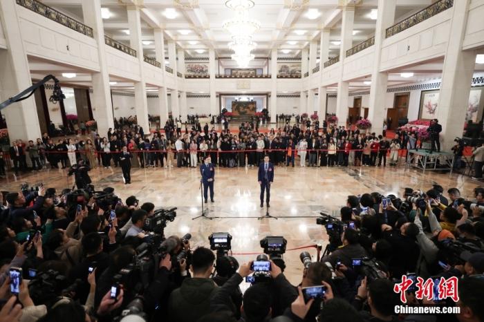 3月5日,十四屆全國(guó)人大三次會(huì)議首場(chǎng)“代表通道”集中采訪活動(dòng)在北京人民大會(huì)堂舉行。全國(guó)人大代表、小米集團(tuán)創(chuàng)始人、董事長(zhǎng)兼首席執(zhí)行官雷軍(右)、全國(guó)人大代表、海爾集團(tuán)董事局主席、首席執(zhí)行官周云杰接受采訪。中新社記者 富田 攝