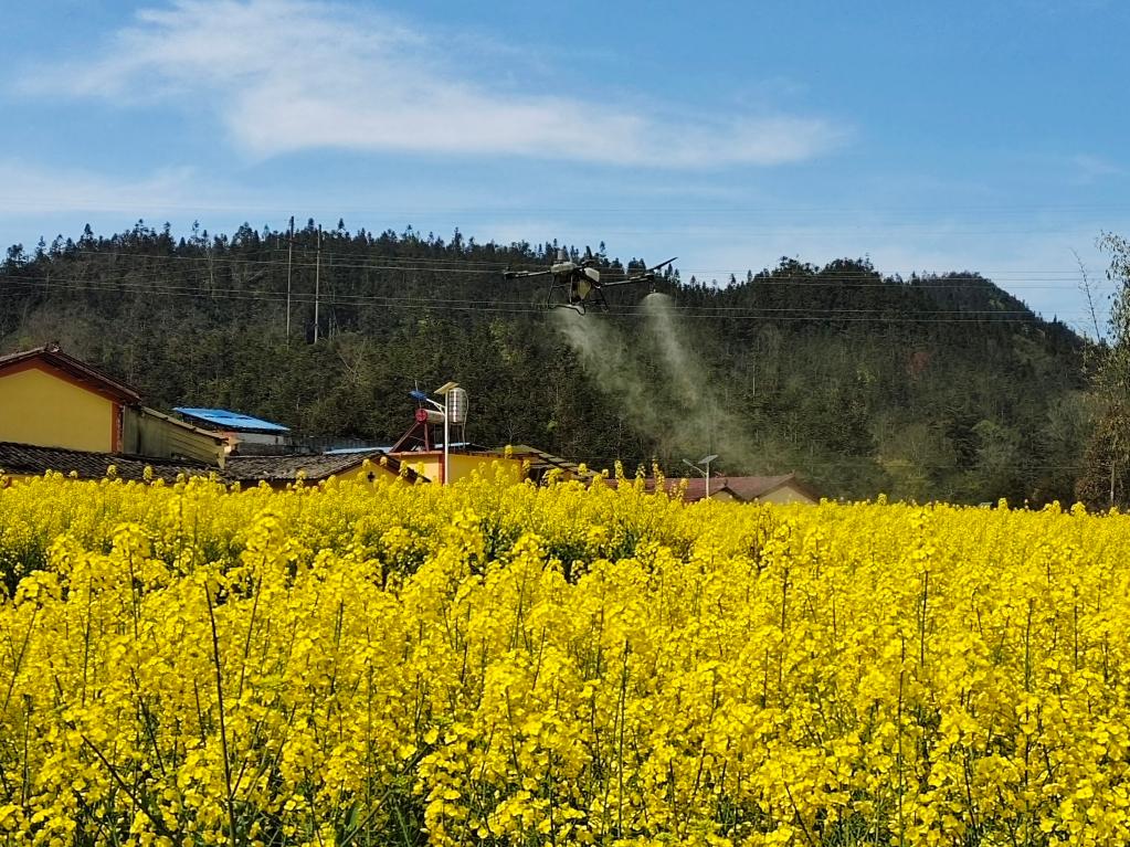 眼下,西部多地油菜進(jìn)入盛花期,做好田間管理尤為重要。在云南省馬關(guān)縣夾寒箐鎮(zhèn)上布高村,縣農(nóng)業(yè)農(nóng)村和科學(xué)技術(shù)局高級農(nóng)藝師李明兵和同事正操作著植保無人機(jī),沿著設(shè)定路線進(jìn)行飛防作業(yè)。無人機(jī)噴灑出霧狀農(nóng)藥,為1500余畝金色的油菜花海布下一道科技感十足的“防護(hù)簾”。