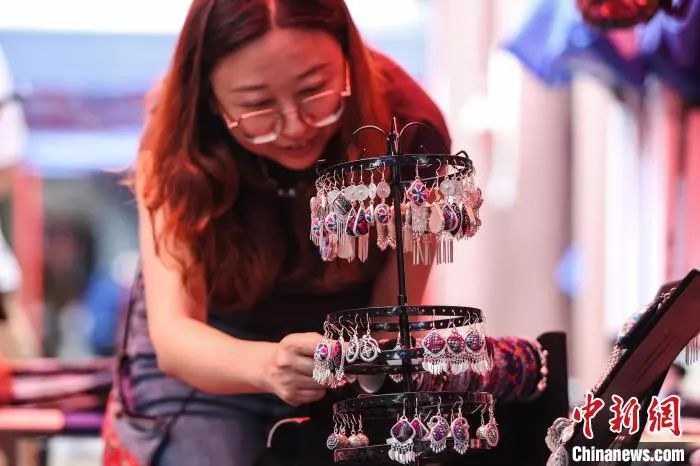 繡里淘非遺集市里的“銀飾+苗繡”組合耳飾吸引游客選購(gòu)。中新社記者 瞿宏倫 攝