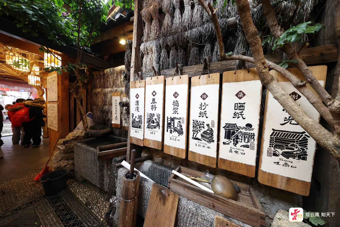 麗江古城內(nèi)以東巴文化體驗(yàn)為亮點(diǎn)的“東巴紙坊”吸引著許多中外游客。在這里,游客們可以體驗(yàn)到搗漿、抄紙、曬紙等東巴紙制作工藝,還能拿起東巴象形文字印章集章打卡。如果你好奇某個(gè)象形文字的含義,還能在這里買到一本東巴文“字典”,一一對(duì)照查看?!跋啾韧辏衲甓嗔瞬簧賮碜孕录悠?、馬來西亞的游客,東巴紙燈、明信片都是很受他們喜愛的產(chǎn)品。”東巴紙坊麗江銷售人員韓雨辰說。