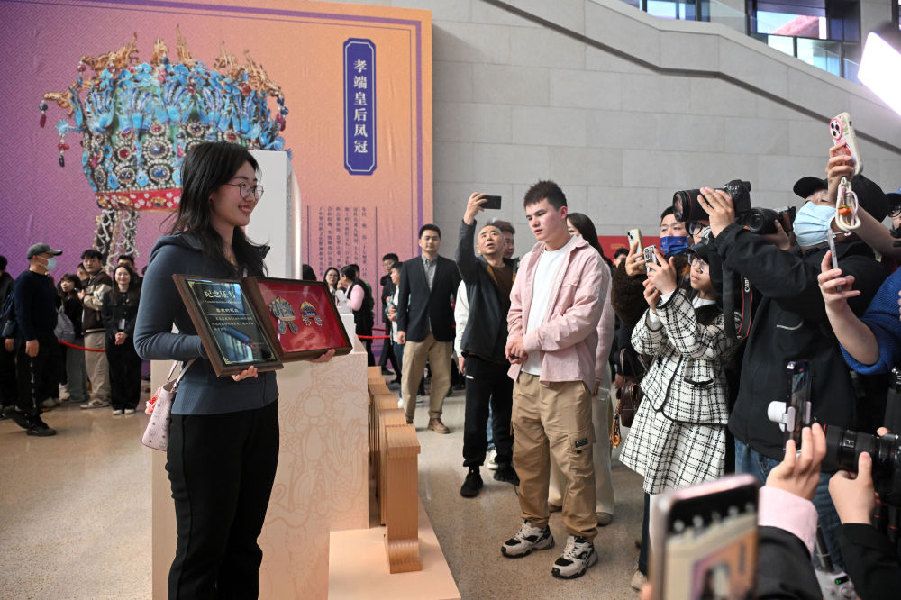 當(dāng)日,國博文創(chuàng)團隊將“紀(jì)念款鳳冠冰箱貼”和紀(jì)念證書贈送給第100萬件鳳冠冰箱貼的購買者——來自山東東營的“95后”觀眾李雅菲。