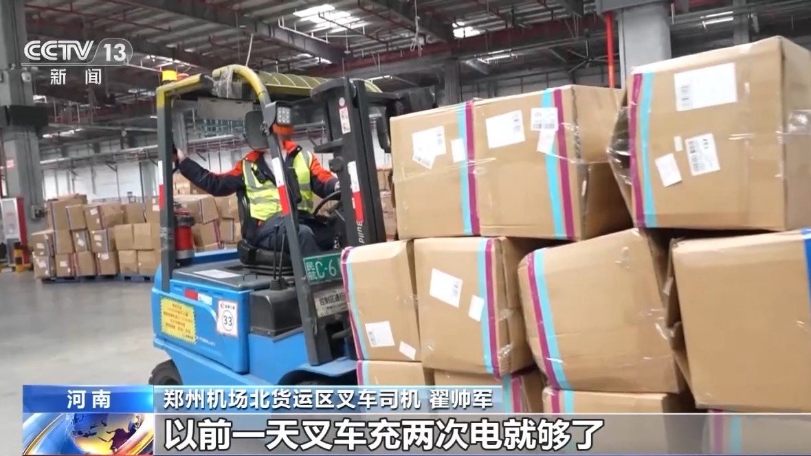 鄭州機(jī)場北貨運(yùn)區(qū)叉車司機(jī) 翟帥軍:飛機(jī)航班多不多,裝得滿不滿,看我這邊就知道,以前一天叉車充兩次電就夠了,現(xiàn)在要充四次電。