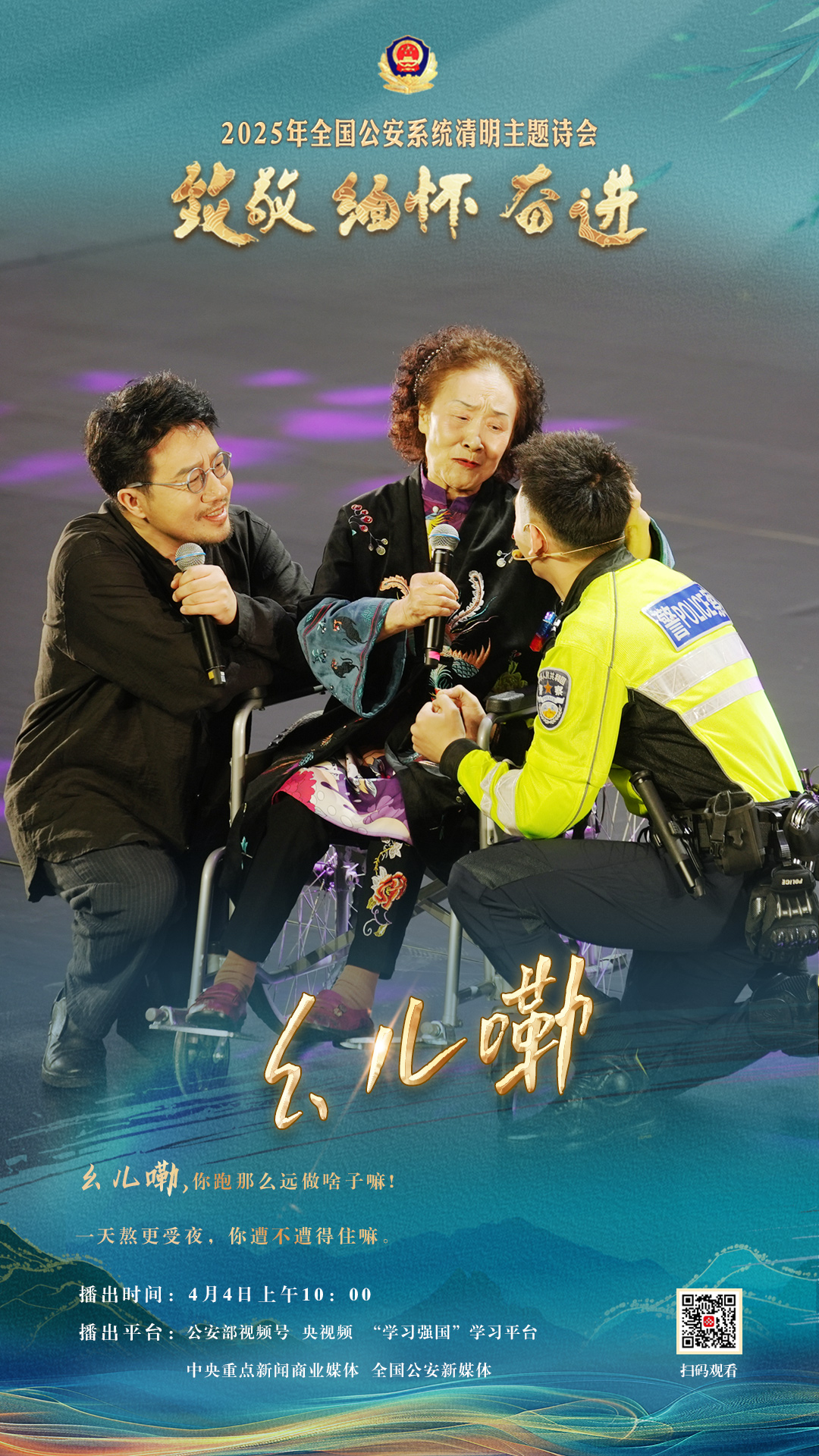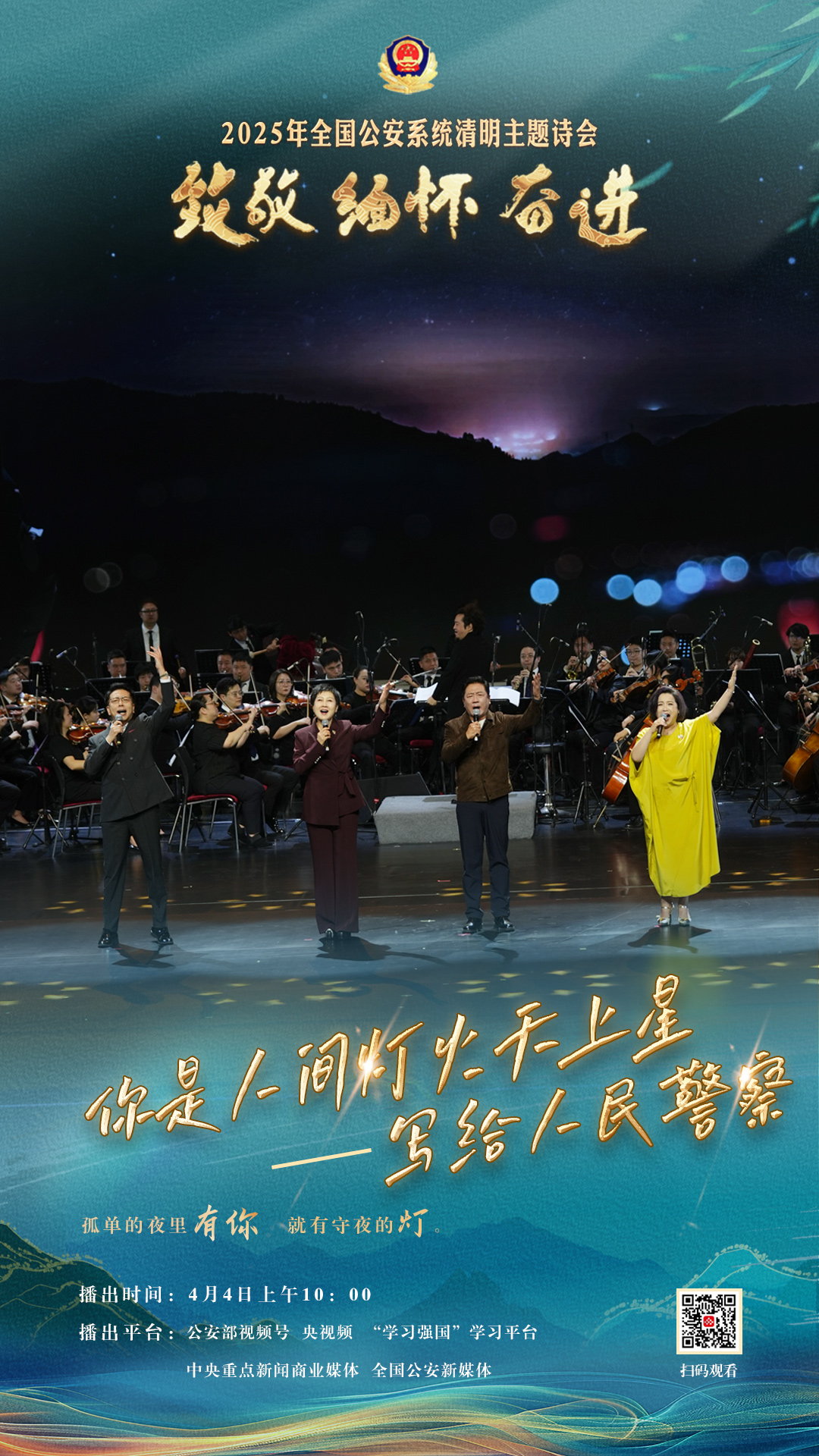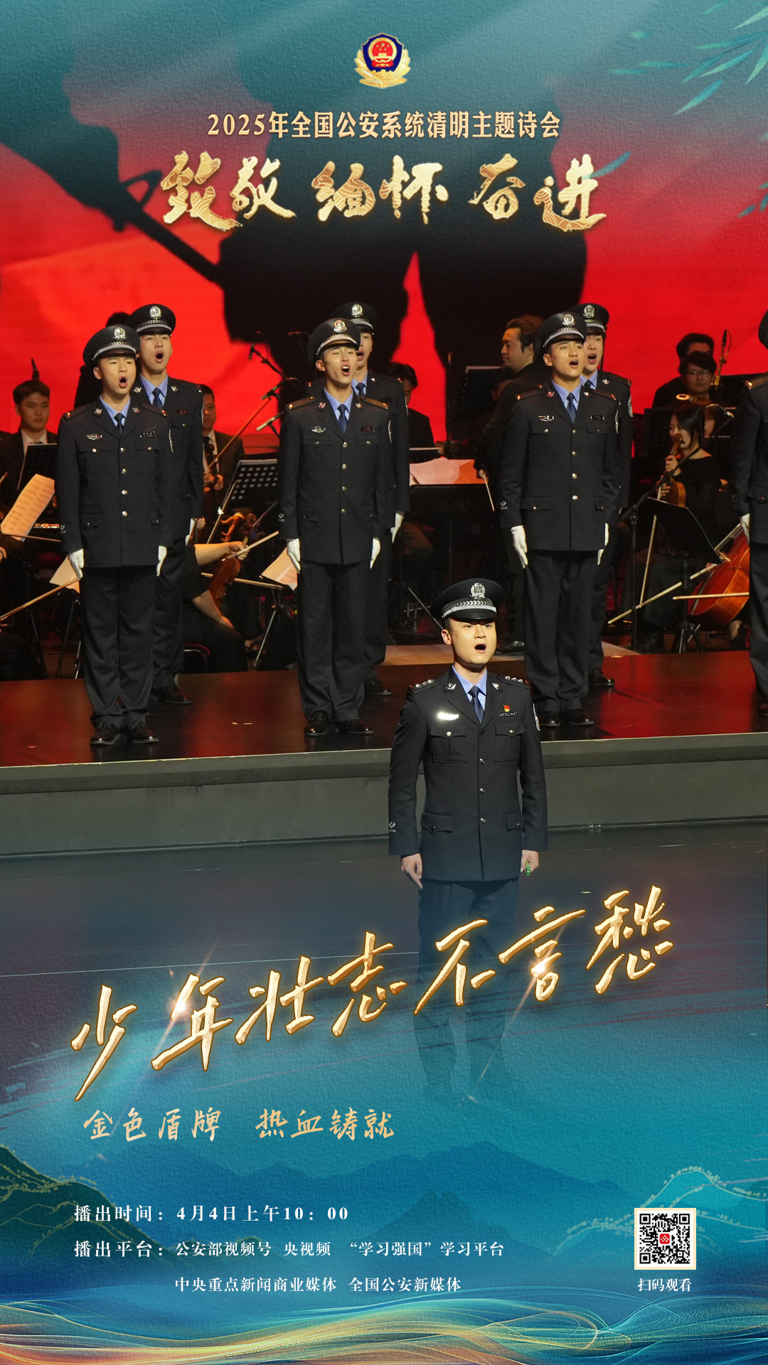 為充分展現(xiàn)全國(guó)公安機(jī)關(guān)和廣大公安民警、輔警時(shí)刻銘記習(xí)近平總書記的關(guān)心關(guān)懷,時(shí)刻為黨和人民而戰(zhàn)的忠誠(chéng)政治本色,深情追憶一年來公安系統(tǒng)涌現(xiàn)的英雄模范感人事跡,激勵(lì)引導(dǎo)廣大公安民警以更加奮發(fā)有為的精神面貌,堅(jiān)決履行好黨和人民賦予的神圣職責(zé)使命,今年清明節(jié)當(dāng)天,公安部新聞宣傳局、全國(guó)公安文聯(lián)、四川省公安廳聯(lián)合舉辦“致敬·緬懷·奮進(jìn)”2025年全國(guó)公安系統(tǒng)清明主題詩(shī)會(huì)。