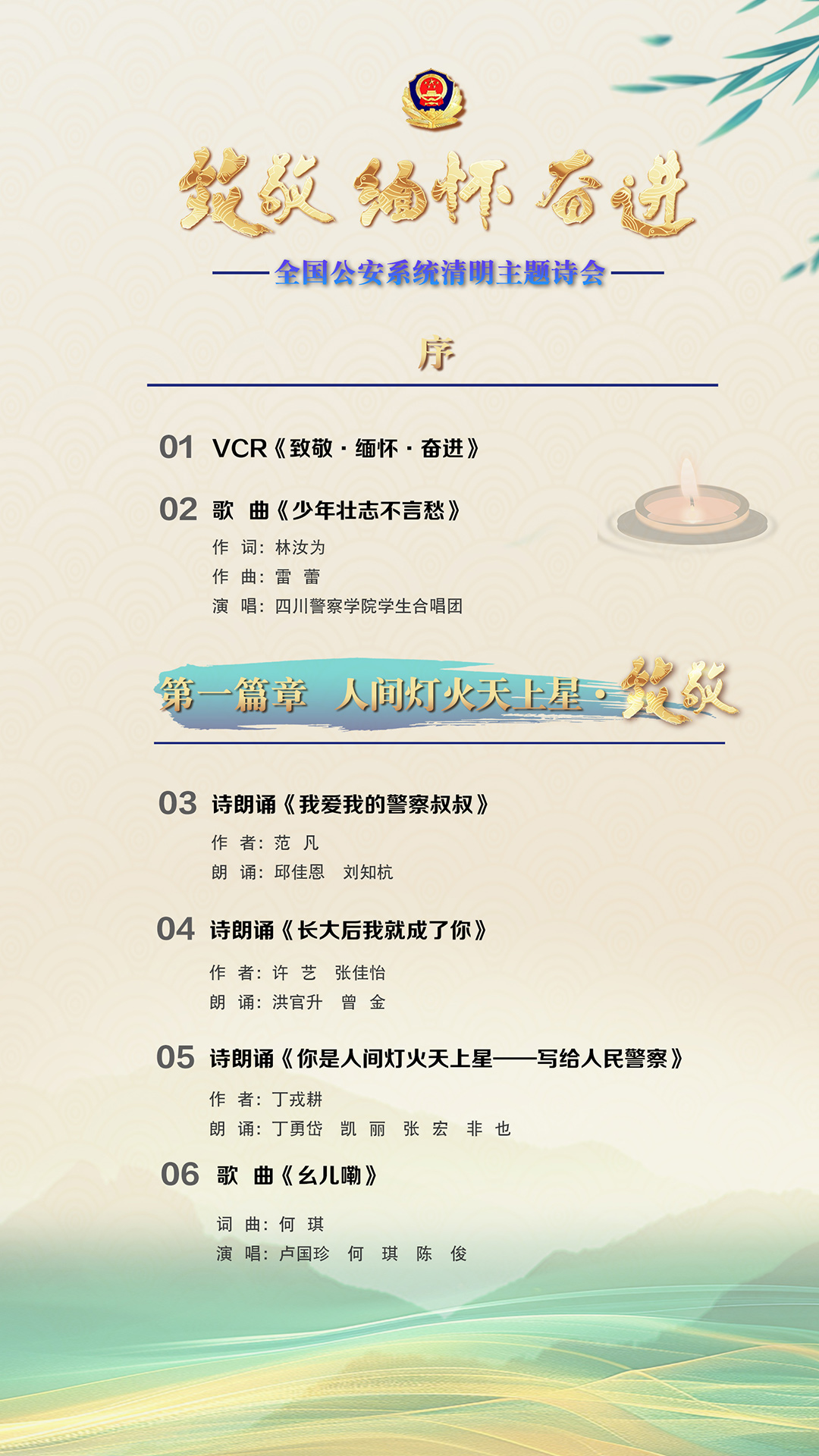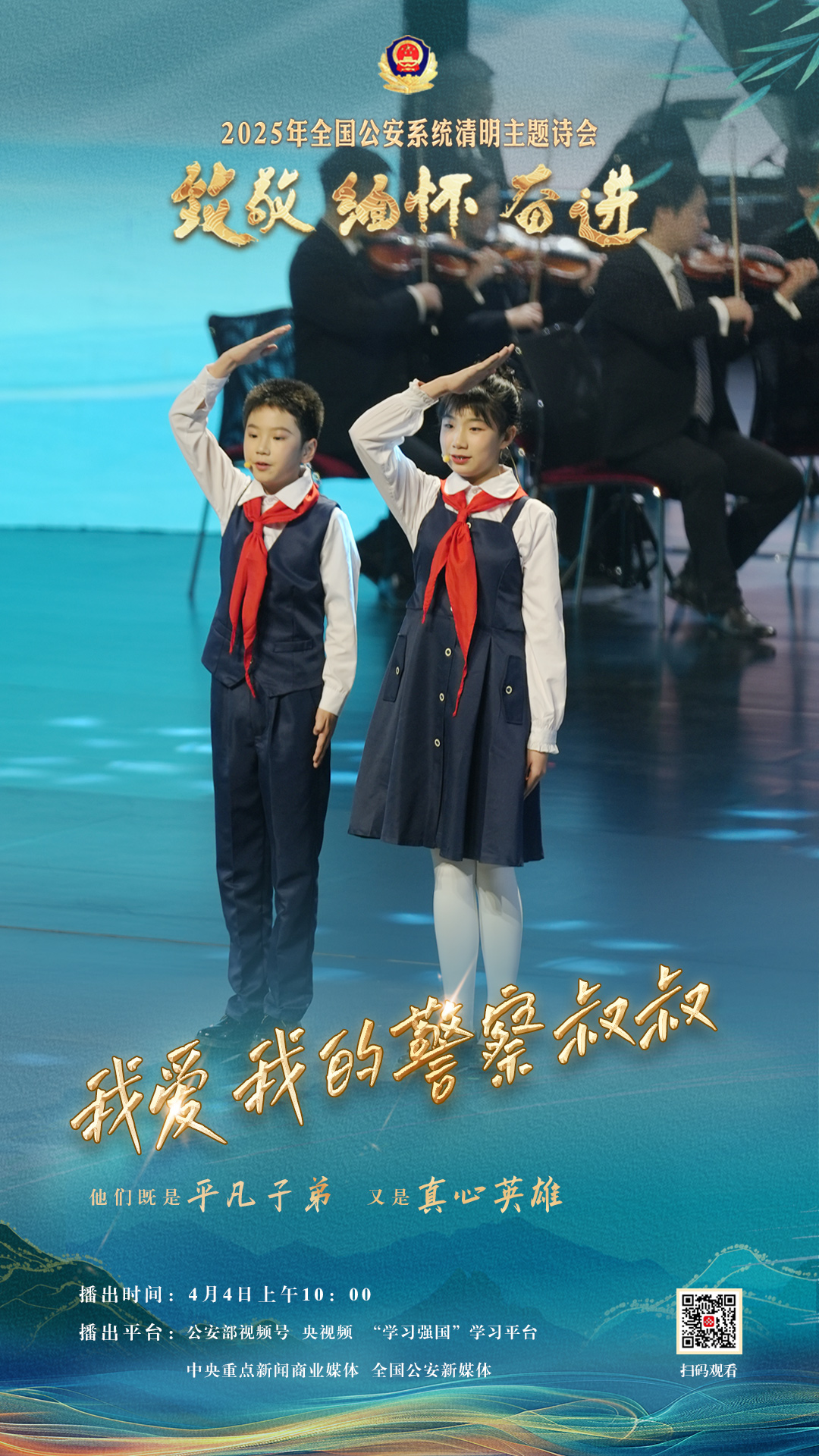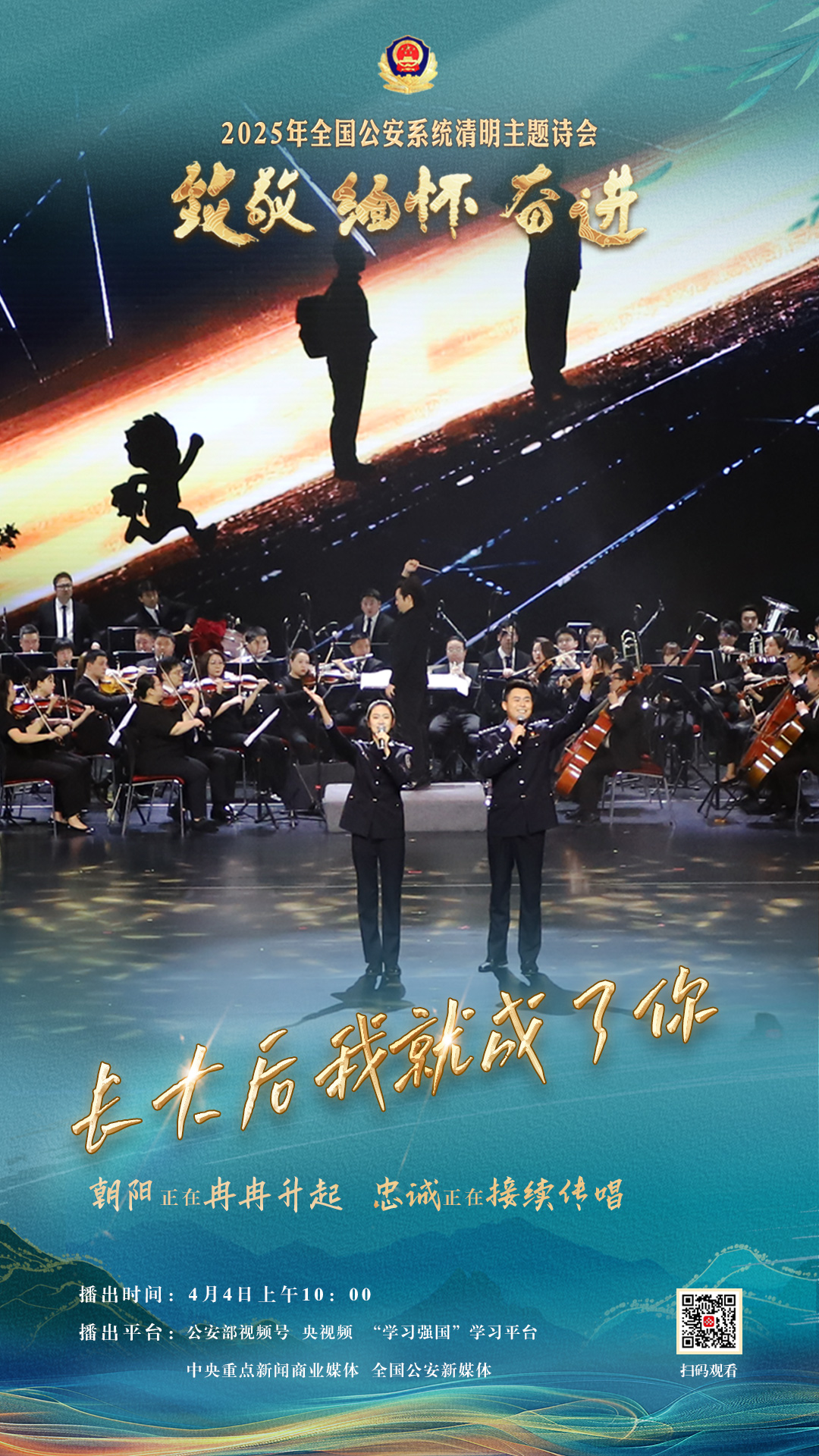 為充分展現(xiàn)全國(guó)公安機(jī)關(guān)和廣大公安民警、輔警時(shí)刻銘記習(xí)近平總書記的關(guān)心關(guān)懷,時(shí)刻為黨和人民而戰(zhàn)的忠誠(chéng)政治本色,深情追憶一年來公安系統(tǒng)涌現(xiàn)的英雄模范感人事跡,激勵(lì)引導(dǎo)廣大公安民警以更加奮發(fā)有為的精神面貌,堅(jiān)決履行好黨和人民賦予的神圣職責(zé)使命,今年清明節(jié)當(dāng)天,公安部新聞宣傳局、全國(guó)公安文聯(lián)、四川省公安廳聯(lián)合舉辦“致敬·緬懷·奮進(jìn)”2025年全國(guó)公安系統(tǒng)清明主題詩(shī)會(huì)。