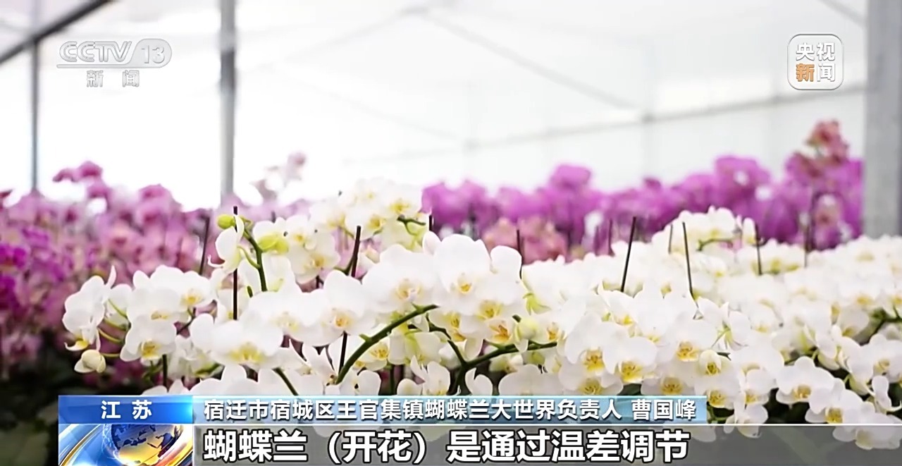 宿遷市宿城區(qū)王官集鎮(zhèn)蝴蝶蘭大世界負(fù)責(zé)人 曹國峰:其實蝴蝶蘭的自然花期應(yīng)該是農(nóng)歷年開始一直到“五一”,這是自然狀態(tài)?,F(xiàn)在我們通過技術(shù)干預(yù),想哪一天開就哪一天開。蝴蝶蘭開花是通過溫差調(diào)節(jié),這個時候我們就要用空調(diào),一些恒溫設(shè)備以及除濕設(shè)備進行恒溫控制。