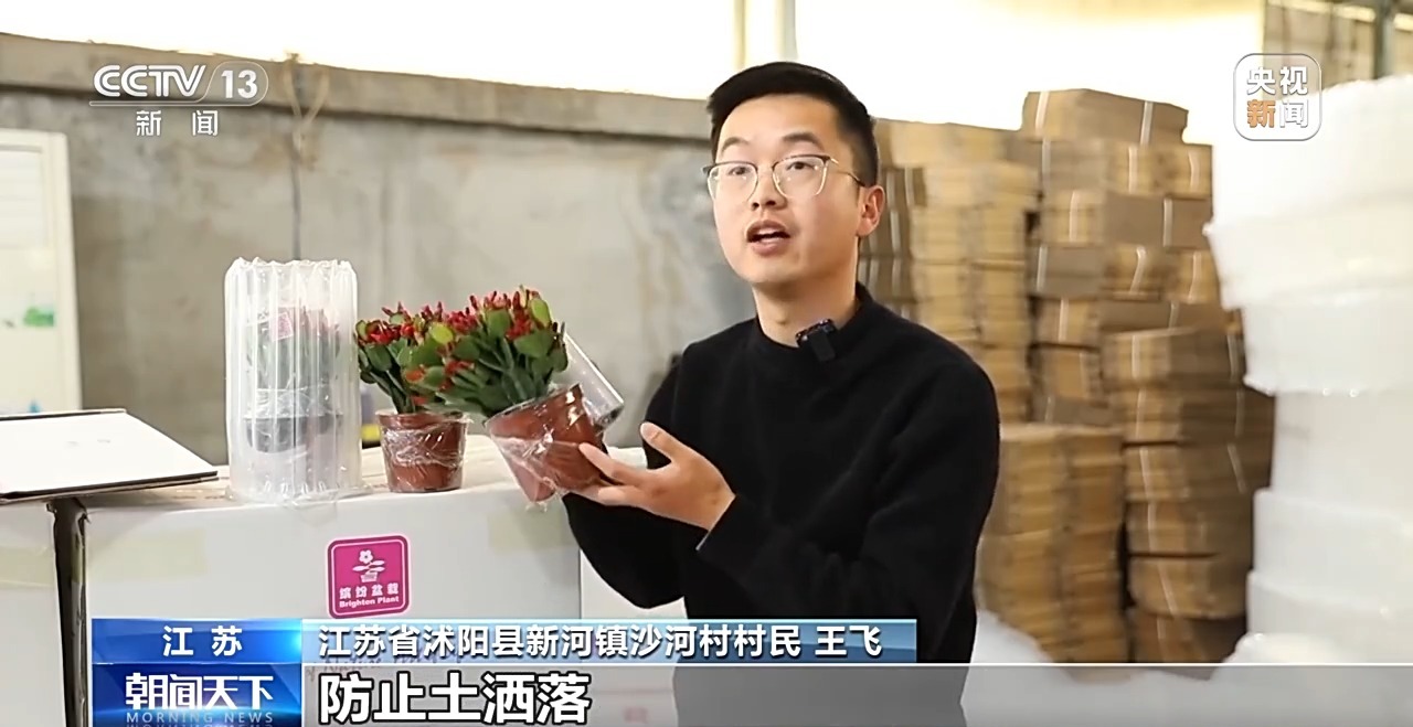 江蘇省沭陽縣新河鎮(zhèn)沙河村村民 王飛:我們先用保鮮膜鎖住盆里面的水分,防止土灑落,這樣的包裝可以讓花到買家手里時更新鮮一點。然后會用到防摔的氣柱,能保護花朵。