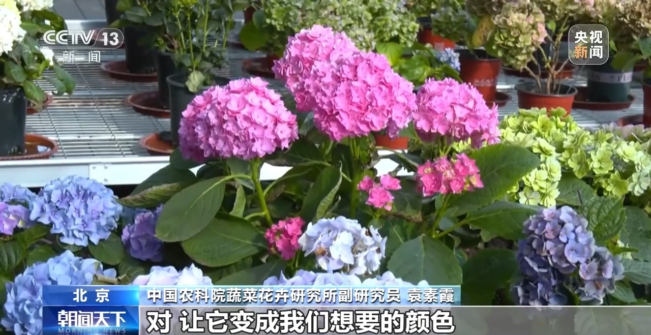 中國農(nóng)科院蔬菜花卉研究所副研究員 袁素霞:讓它往藍(lán)變的過程中,變成其他的顏色,比如藍(lán)紫色、紫羅蘭色都是可以的。因為我們在土壤中加入了一個關(guān)鍵的重要物質(zhì)鋁離子,可以精準(zhǔn)調(diào)控,可以讓花變成我們想要的顏色。