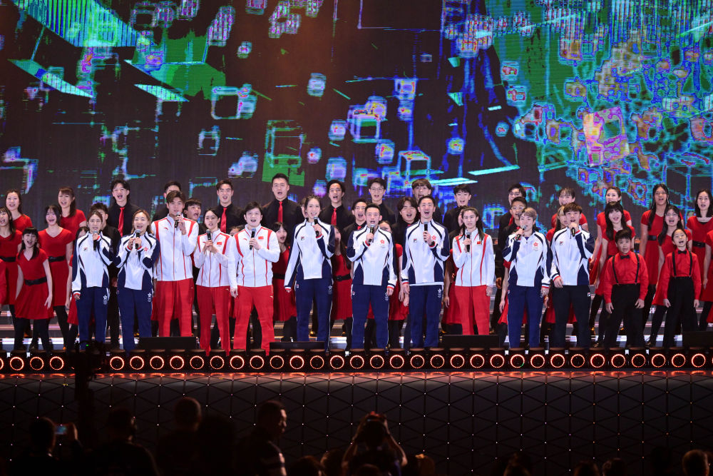 3月1日,在香港啟德體育園開(kāi)幕典禮上,內(nèi)地與香港運(yùn)動(dòng)員代表合唱歌曲。新華社記者 朱煒 攝