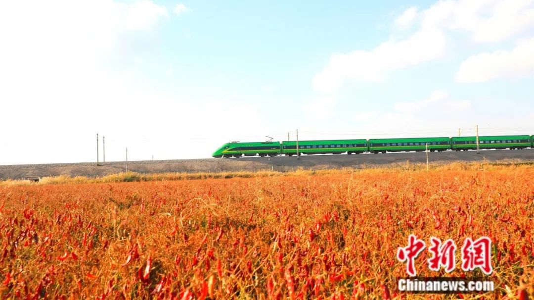 列車駛過(guò)新疆焉耆縣辣椒地。楊志榮 攝