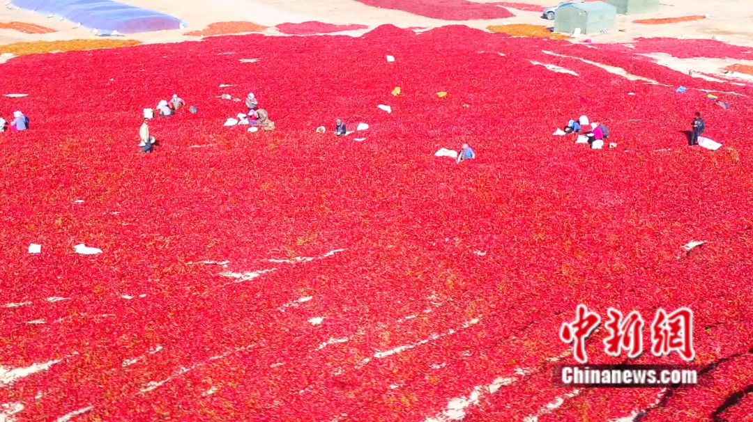 航拍焉耆縣焉耆鎮(zhèn)農(nóng)民晾曬紅辣皮子。楊志榮 攝