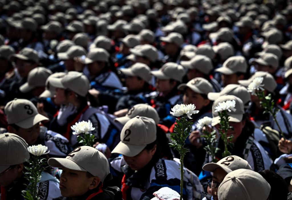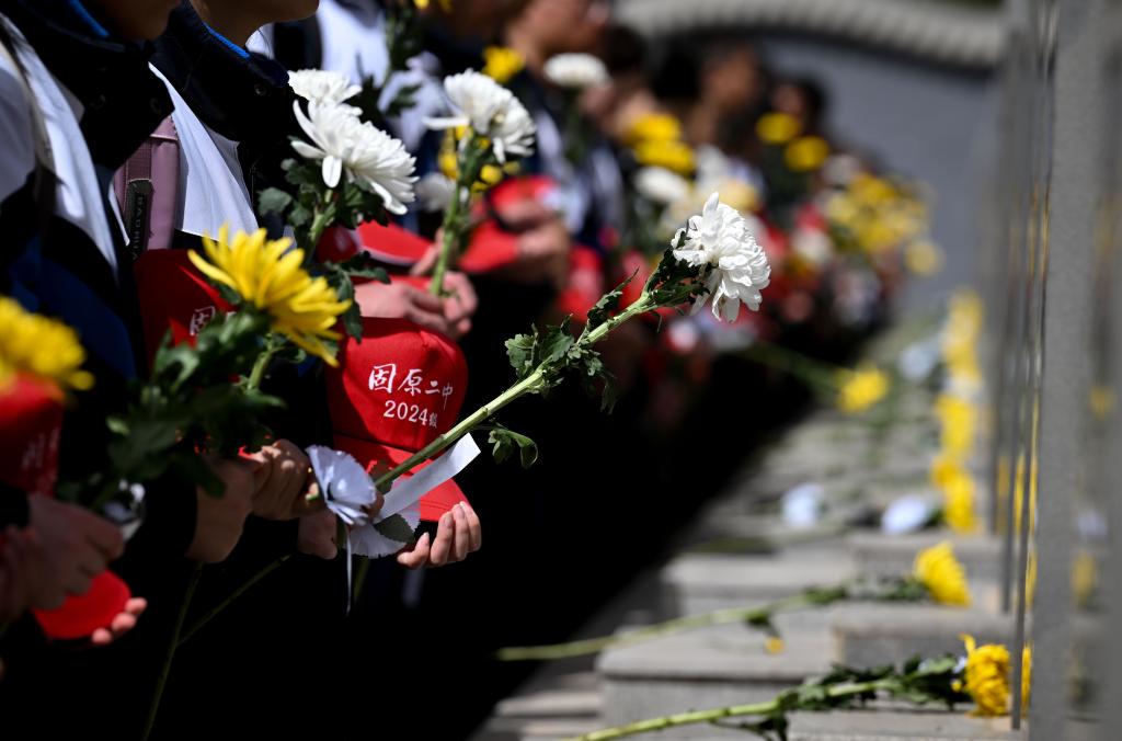 4月3日,抵達任山河烈士陵園的學生們手持白菊原地休整。