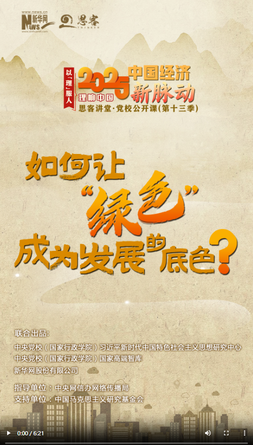 新一季“思客講堂·黨校公開(kāi)課”《理響中國(guó)·以理服人|2025中國(guó)經(jīng)濟(jì)新脈動(dòng)》,帶你讀懂2025年經(jīng)濟(jì)工作重點(diǎn)。藍(lán)天、碧水、凈土;節(jié)能、減排、降碳;生態(tài)優(yōu)先、綠色消費(fèi)、零碳工廠……一個(gè)個(gè)生動(dòng)的綠色畫(huà)筆,勾勒出高質(zhì)量發(fā)展的底色。綠色打底,發(fā)展更優(yōu)。怎么讓“綠色”成為發(fā)展的底色?如何激活全面綠色轉(zhuǎn)型的潛力?中央黨校(國(guó)家行政學(xué)院)社會(huì)和生態(tài)文明教研部副教授韓融給出了答案。
