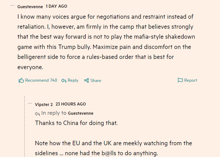 中國(guó)的嚴(yán)正立場(chǎng)也引發(fā)了同樣受到美國(guó)關(guān)稅影響的各國(guó)網(wǎng)民對(duì)中國(guó)的廣泛支持。在英國(guó)《金融時(shí)報(bào)》相關(guān)報(bào)道評(píng)論區(qū),獲贊最多的一條網(wǎng)友評(píng)論稱:“我知道有許多聲音主張通過談判和克制來解決問題,而不是采取反制行動(dòng)。然而,我強(qiáng)烈認(rèn)為最好的前進(jìn)方式就是將好戰(zhàn)一方的痛苦和不適最大化,如此才能建立一個(gè)對(duì)所有人都有利的基于規(guī)則的秩序?!?/p>
