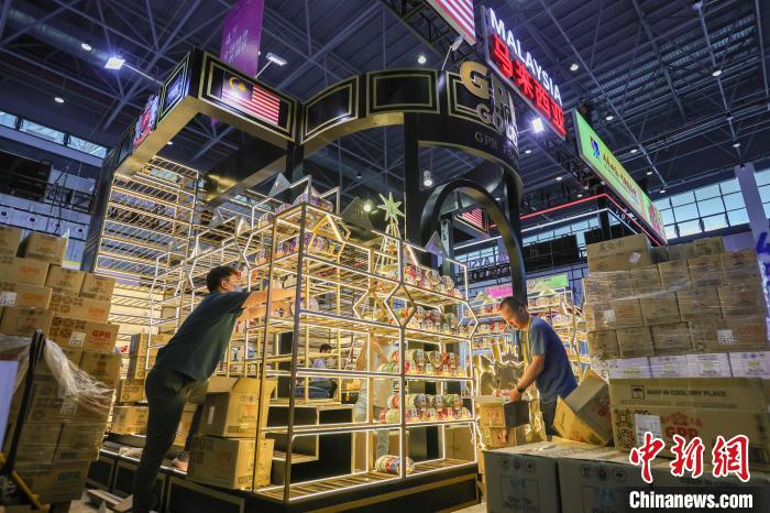 4月11日,第五屆中國(guó)國(guó)際消費(fèi)品博覽會(huì)即將開展,馬來西亞館的展商在布置展品。中新社記者 駱云飛 攝