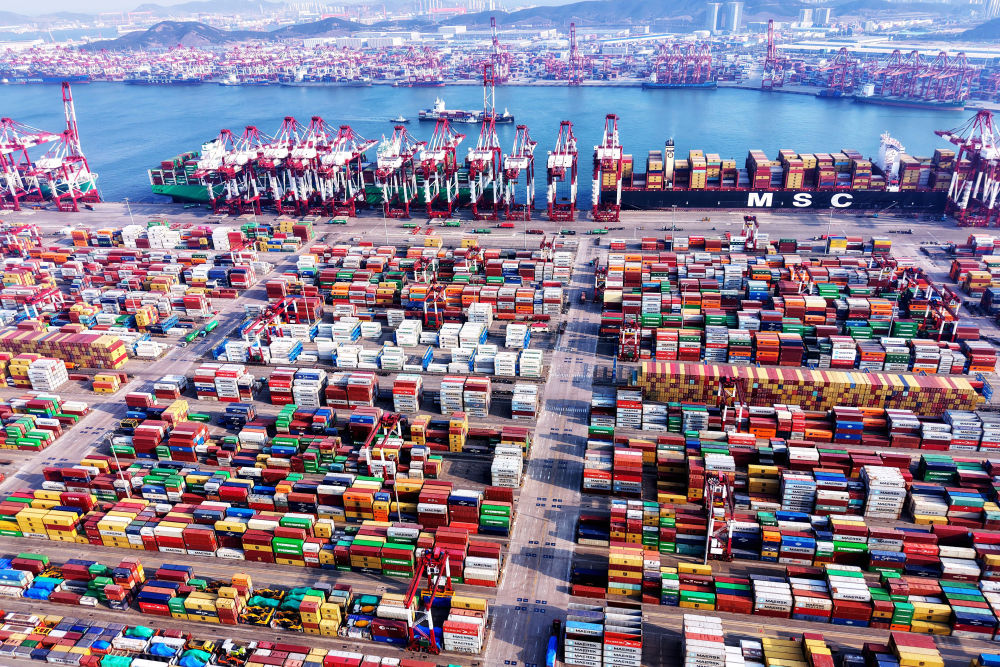 這是2月23日拍攝的山東港口青島港外貿(mào)集裝箱碼頭(無人機(jī)照片)。2025年以來,青島港開通2條到東南亞、地中海方向的“一帶一路”航線,合計新開4條國際集裝箱航線,加快世界一流海洋港口建設(shè)。新華社發(fā)(俞方平 攝)