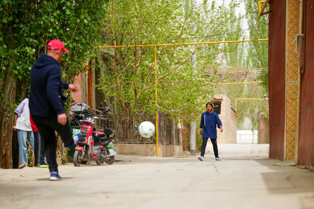↑4月13日,在阿圖什市亞喀巴格村,乃菲賽與父親一起踢球。新華社記者 徐宏巖 攝