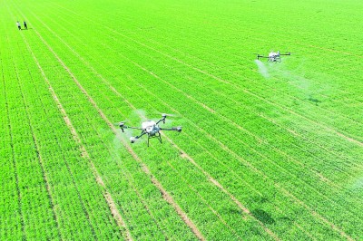 山東省青島市即墨區(qū)段泊嵐鎮(zhèn)瓦戈莊村綠色增糧先行示范區(qū),農(nóng)民采用植保無(wú)人機(jī)為小麥噴灑葉面肥。新華社發(fā)