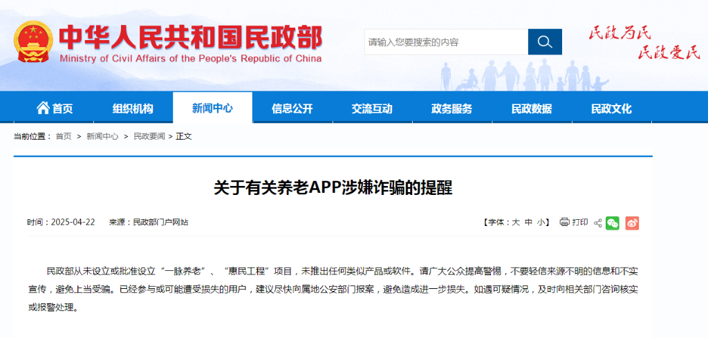 4月22日,民政部發(fā)布公告表示,民政部從未設立或批準設立“一脈養(yǎng)老”“惠民工程”項目,未推出任何類似產品或軟件。請廣大公眾提高警惕,不要輕信來源不明的信息和不實宣傳,避免上當受騙。已經參與或可能遭受損失的用戶,建議盡快向屬地公安部門報案,避免造成進一步損失。如遇可疑情況,及時向相關部門咨詢核實或報警處理。(記者朱高祥)