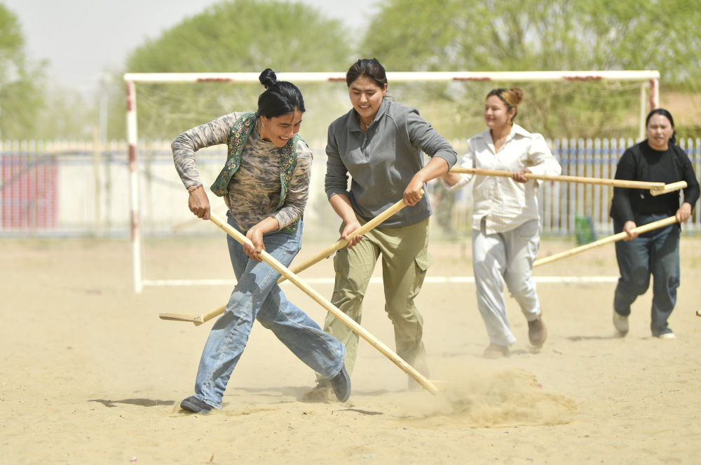 達里雅布依鄉(xiāng)女子麥熱球隊的訓練場地,就是一片被胡楊、紅柳包圍著的沙地操場。麥熱球類似曲棍球,是一種在新疆和田地區(qū)廣泛流行的古老運動。這項群眾性運動并沒有過于嚴格的規(guī)則,一片空地,三五好友,興之所起,即可揮桿。2021年,麥熱球被正式列入國家級非物質文化遺產代表性項目名錄。