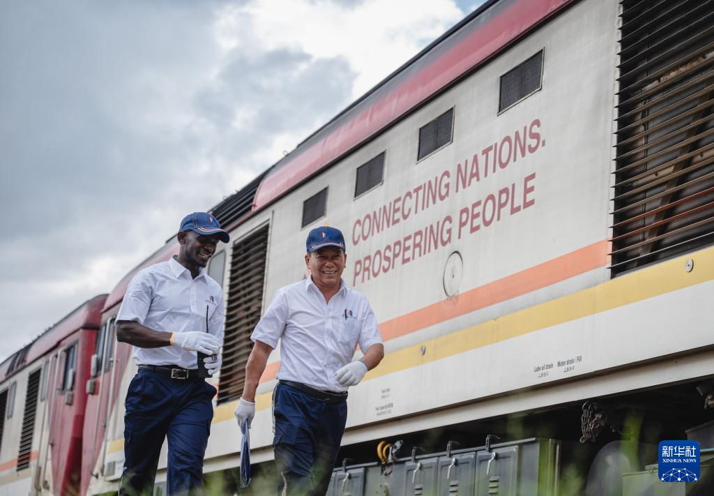 2023年5月23日,在肯尼亞內(nèi)羅畢,非洲之星鐵路運(yùn)營(yíng)公司機(jī)輛部的火車駕駛員蔣立平(右)與學(xué)員霍勒斯從一輛印有“連接國(guó)家 走向繁榮”標(biāo)語(yǔ)的蒙內(nèi)鐵路機(jī)車旁走過。 新華社記者 王冠森 攝