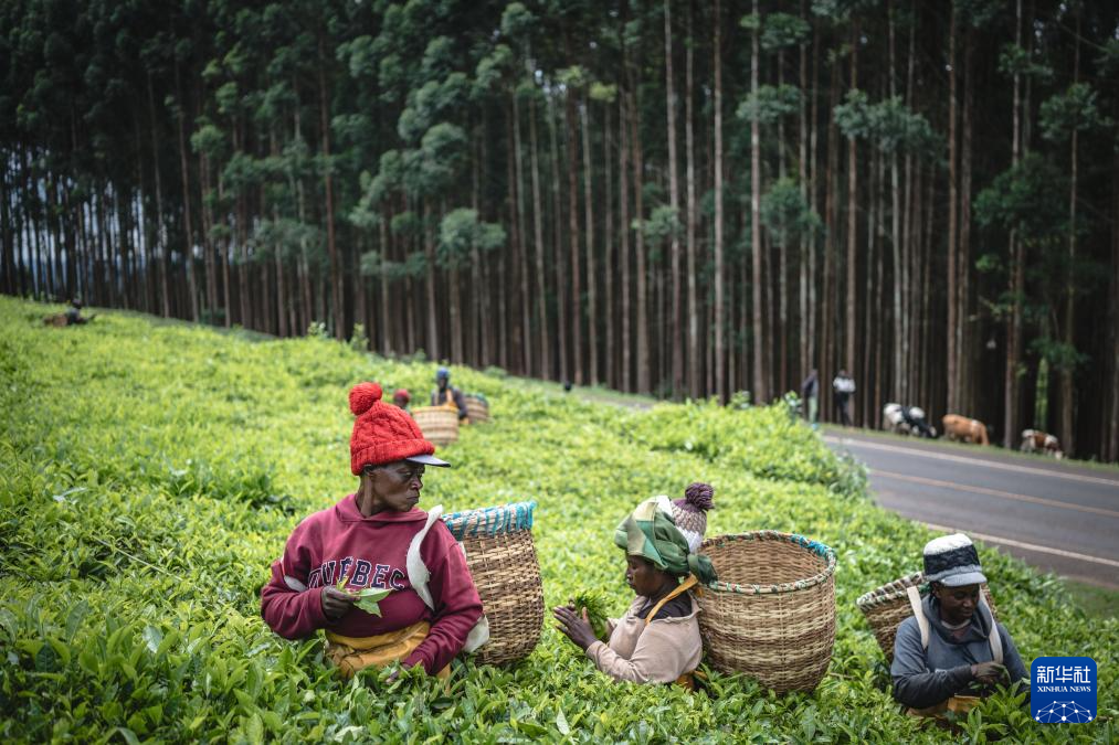 2025年4月5日,農(nóng)民在肯尼亞凱里喬C22公路旁的茶田采茶。 新華社記者 王冠森 攝