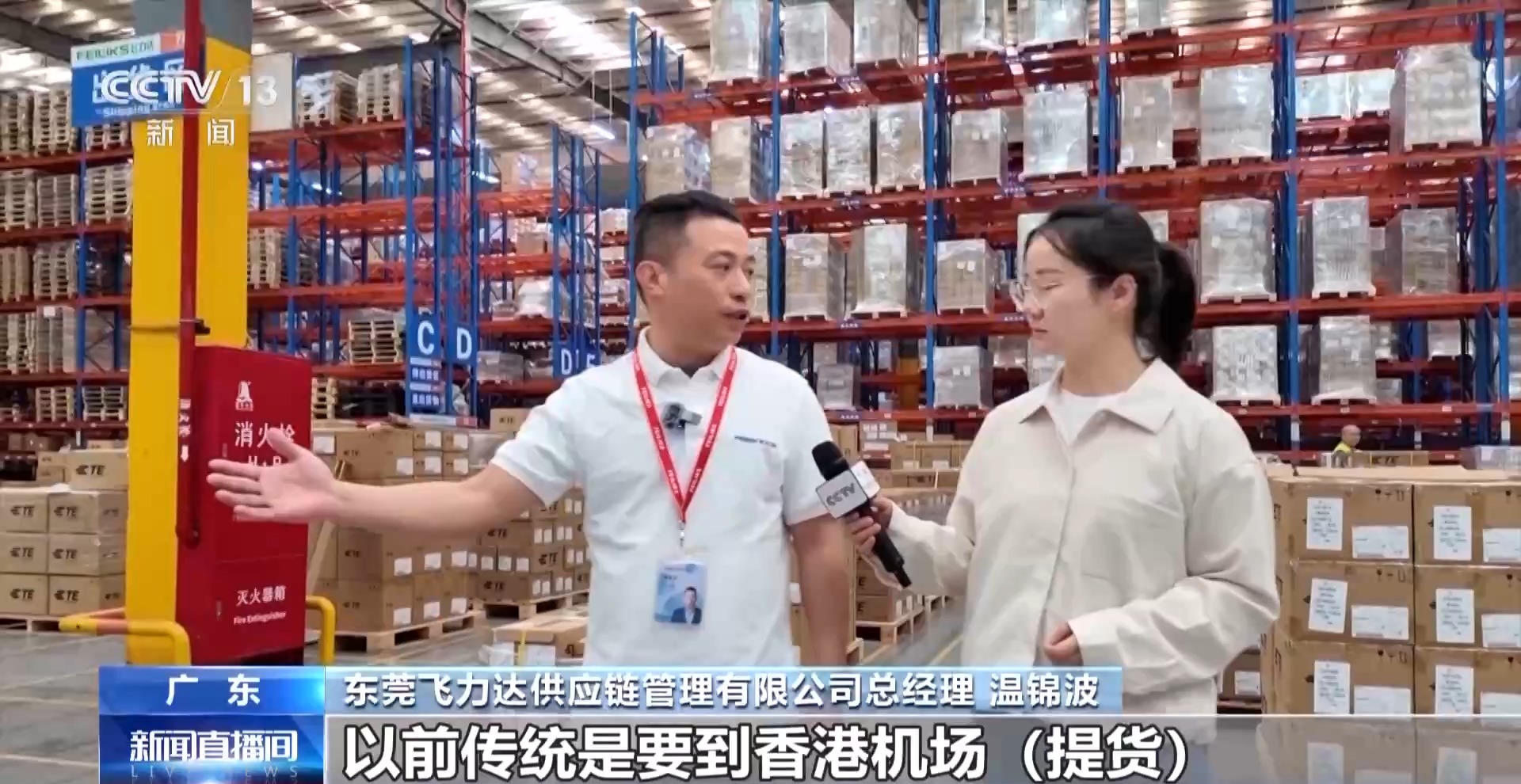 東莞飛力達供應鏈管理有限公司總經理 溫錦波:以前傳統(tǒng)是要到香港機場提貨,現(xiàn)在不用拆包、不用申報,直接拉到空港中心,再進行一站式的進口申報。在我們家門口500米,就可以提回來倉庫,非常方便。