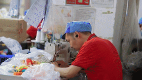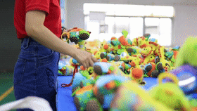 車間另一頭,品檢組組長梁建敏正給玩具成品審核把關(guān)。梁建敏很瘦,但很有能量,拖貨、倒貨、檢查貨,好像總有使不完的力氣,臉上總是掛著陽光般的笑容,眼睛里充滿對工作的熱忱。她驗貨時不單用眼睛,還會把毛絨玩具貼近耳朵來聽。