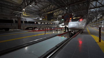 動車進(jìn)入檢修庫內(nèi),工作人員正根據(jù)任務(wù)計劃進(jìn)行動車組一級修作業(yè)。