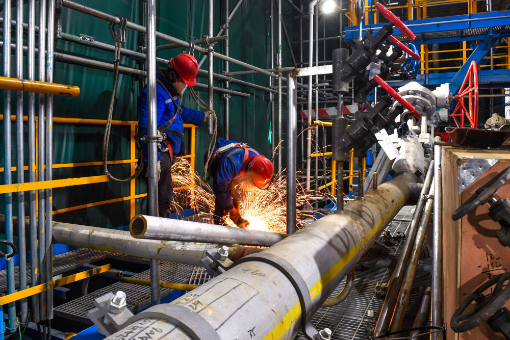 2月12日,工人在位于吉林省吉林市的中國石油吉林石化公司煉油化工轉(zhuǎn)型升級項目120萬噸/年乙烯裝置建設(shè)現(xiàn)場施工作業(yè)。新華社記者 許暢 攝