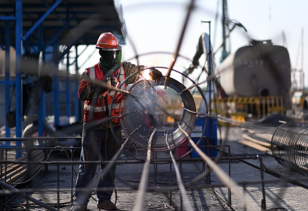 4月25日,工人在天津港第一港埠有限公司散糧三期新建筒倉工程建設(shè)現(xiàn)場施工。新華社記者 趙子碩 攝