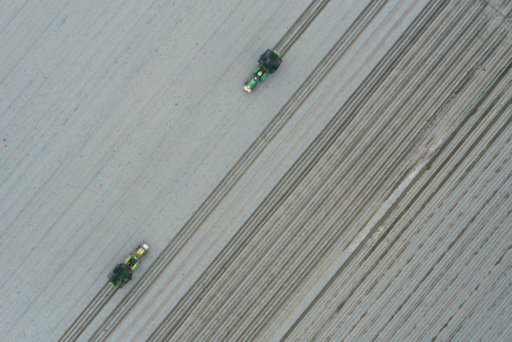 在新疆巴音郭楞蒙古自治州博湖縣本布圖鎮(zhèn),農(nóng)戶操作移栽機(jī)在農(nóng)田里移栽辣椒苗(4月28日攝,無(wú)人機(jī)照片)。新華社記者丁磊 攝