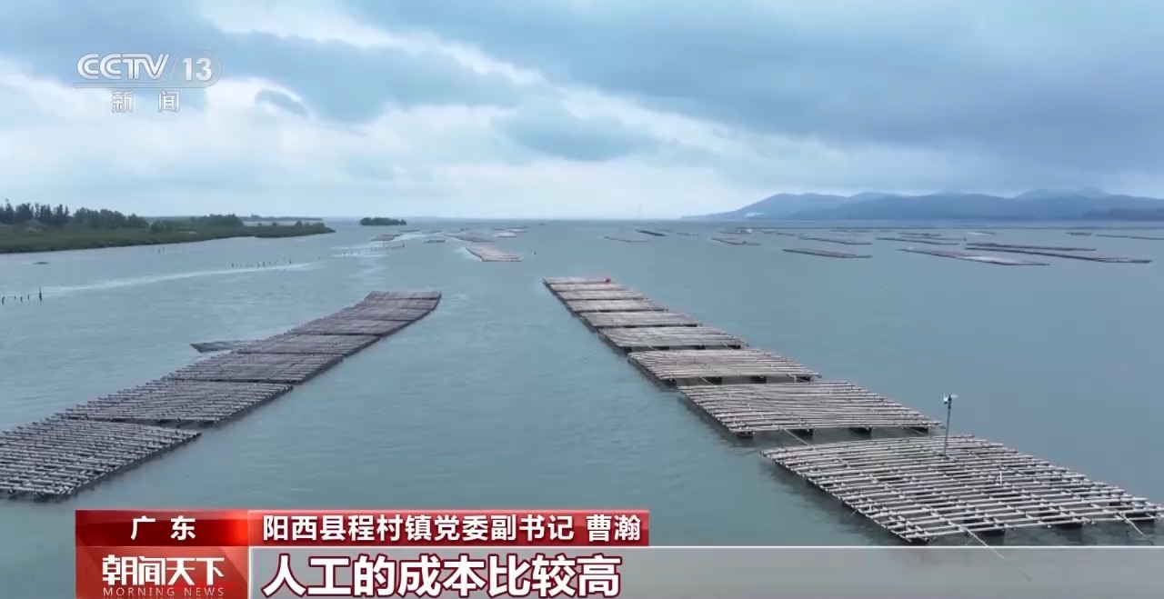 陽西縣程村鎮(zhèn)黨委副書記 曹瀚:以前的立柱式養(yǎng)殖必須要有水泥樁,還要打樁進去,人工的成本比較高。延繩吊養(yǎng)生蠔的時候,我們能夠及時根據海水咸濕度情況進行轉移,有利于蠔盡快長大。