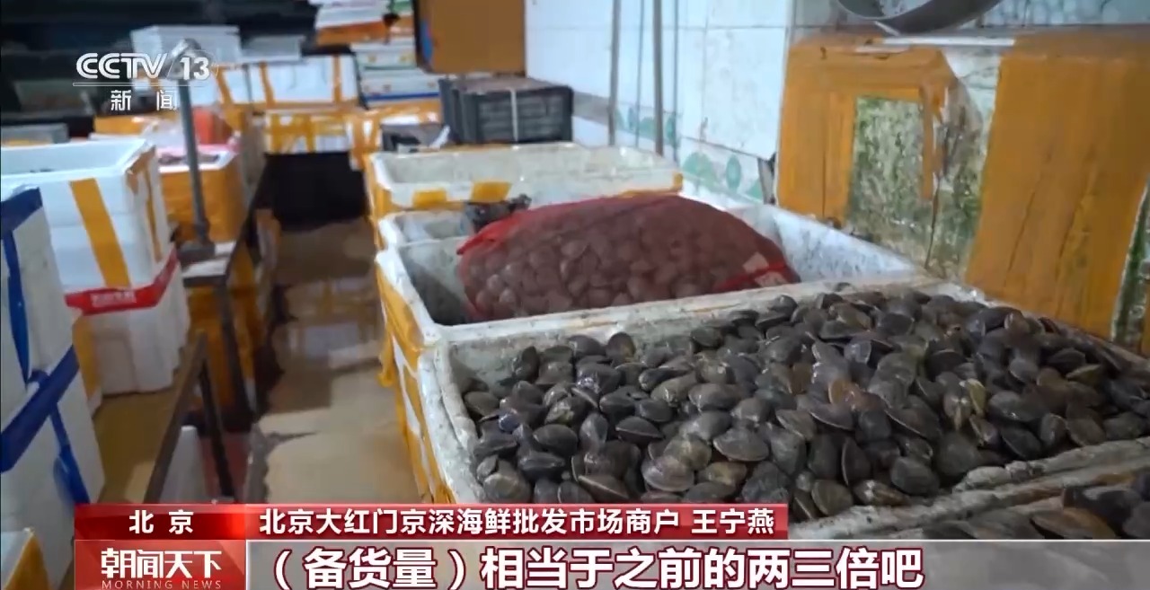 北京大紅門京深海鮮批發(fā)市場商戶 王寧燕:根據“五一”的情況,扇貝、生蠔這種適合聚餐的,我們會多備一點,備貨量相當于之前的兩三倍吧。