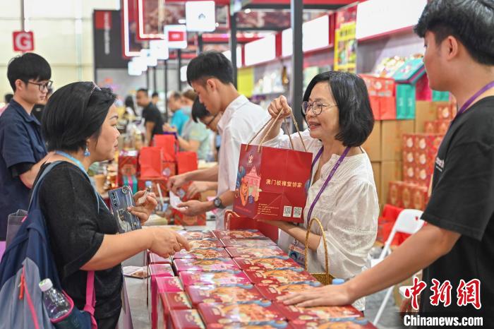在澳門展館,各種美食、咖啡和葡萄酒吸引采購(gòu)商前來(lái)品嘗,其中,澳門媽閣餅家的展位前擠滿了試吃者。
