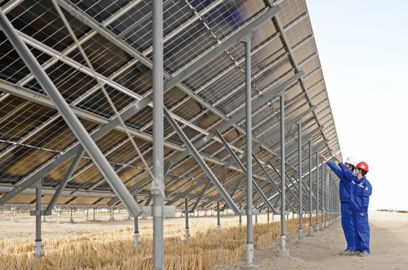 “光伏板不僅可以發(fā)電,還可以降低地表風(fēng)速,起到穩(wěn)定沙土的作用。”中電建(沙雅)新能源發(fā)電有限公司項(xiàng)目經(jīng)理杜思偉介紹,草方格不僅能減少沙塵流動(dòng),還能為梭梭苗提供生長(zhǎng)保護(hù)??焖偕L(zhǎng)的梭梭苗又能以強(qiáng)大的根系,扎根沙土穩(wěn)固沙地。