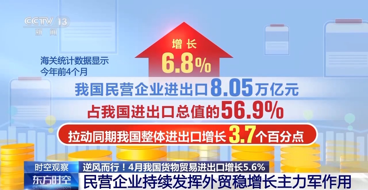 海關(guān)總署統(tǒng)計(jì)分析司司長(zhǎng) 呂大良:今年以來(lái),各項(xiàng)促進(jìn)民營(yíng)經(jīng)濟(jì)發(fā)展的政策措施協(xié)同發(fā)力,參與外貿(mào)的民營(yíng)企業(yè)數(shù)量穩(wěn)定增加。前4個(gè)月,有進(jìn)出口實(shí)績(jī)的民營(yíng)企業(yè)達(dá)49.2萬(wàn)家,增加8.2%,占我國(guó)有進(jìn)出口實(shí)際企業(yè)數(shù)量的86.5%。
